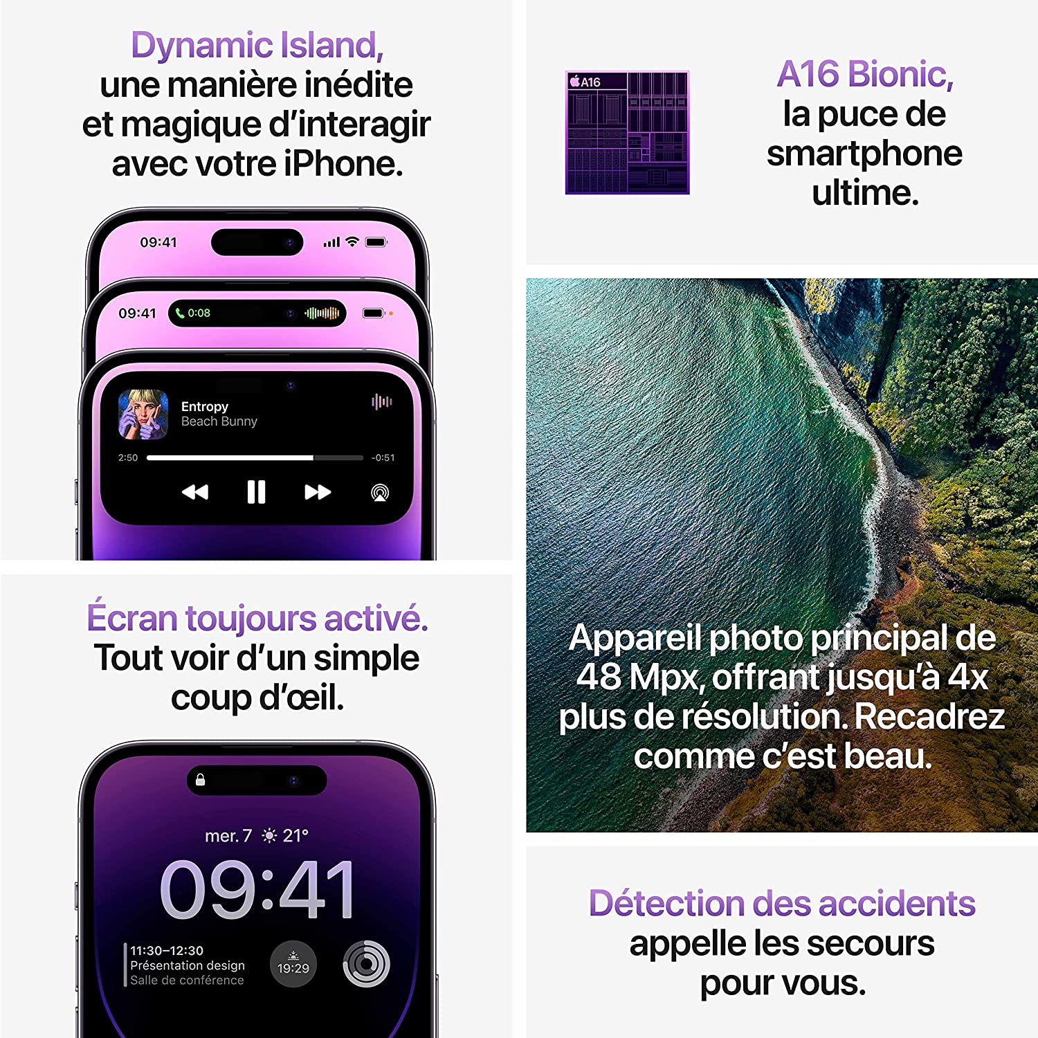 iPhonesL'iPhone 14 Pro est l'un des iPhone de la 16e génération du smartphone d'Apple annoncé le 7 septembre 2022. Il introduit un nouvel écran OLED de 6,1 pouces avec un poinçon dynamique pour le capteur FaceID et la caméra frontale ainsi qu'une fréquence de rafraîchissement dynamique de 120 Hz à 1 Hz pour le Always on Display. Il possède également un nouveau SoC Apple A16 gravé en 4 nm et un nouveau triple capteur photo de 48+12+12 mégapixels avec téléobjectif X3 et ultra grand-angle. Il est disponible à partir du 16 septembre 2022 à partir de 1329 euros.